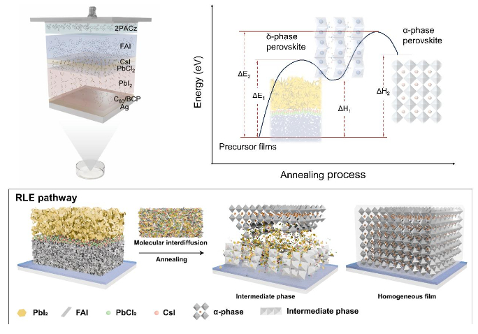 论文通讯作者郭庆勋副教授形象地表述道,传统做法可能是先铺金属卤化物“砖块”,再浇甲脒氢碘酸盐“水泥”;而他们的新方法则是反其道而行之,先沉积“水泥”,再沉积“砖块”。这种巧妙的顺序,结合一种自组装分子的“粘合剂”作用,在后续退火时能极大地促进固态原料之间的相互反应和扩散,最终“生长”出高质量、结构完美的钙钛矿晶体薄膜。