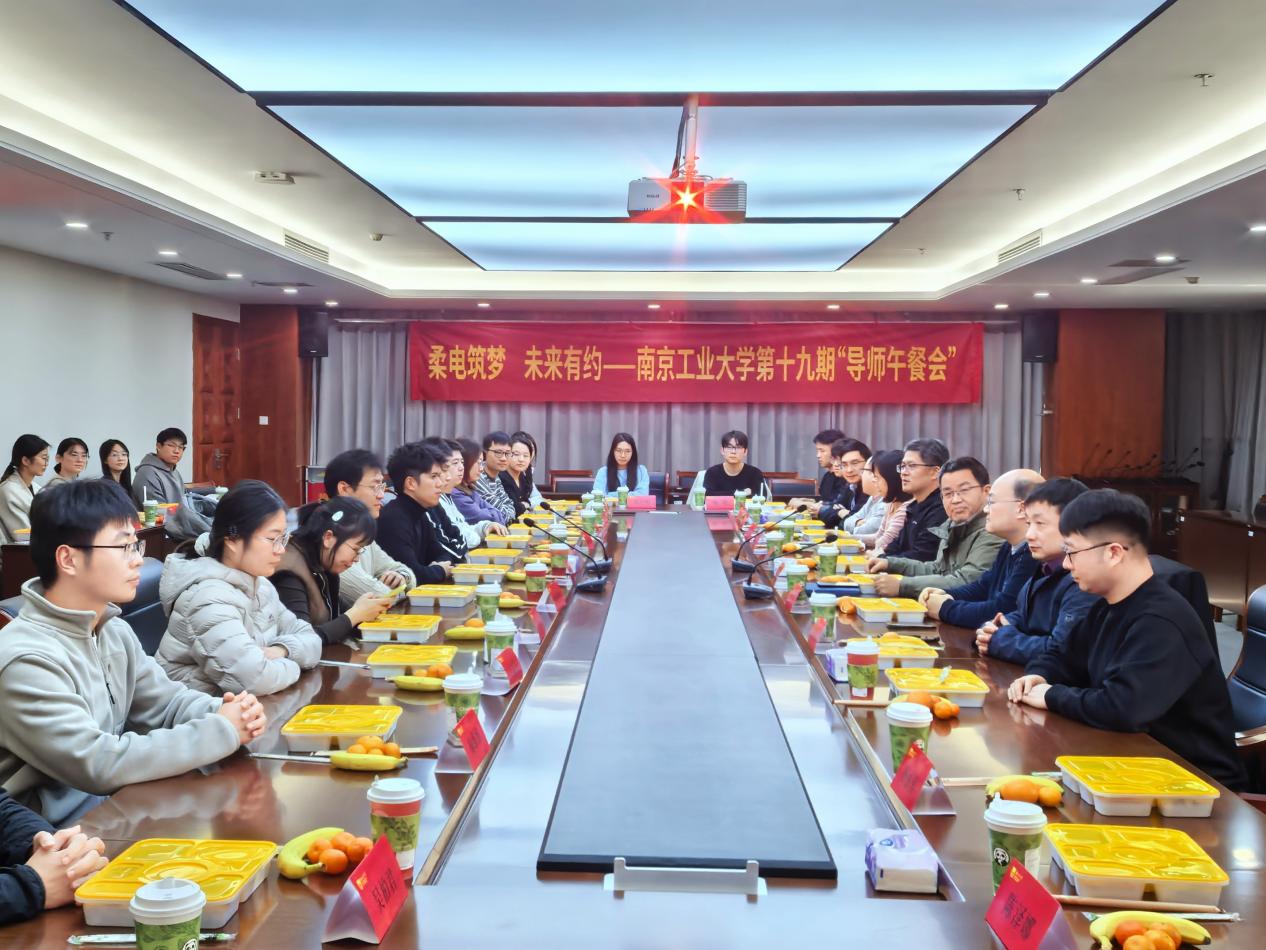 12月10日中午,由党委研究生工作部主办、柔性电子(未来技术)学院承办的第十九期研究生“导师午餐会”在丁家桥校区科创D楼1903室顺利举行。本次活动以“柔电筑梦 未来有约”为主题,柔性电子(未来技术)学院党委书记马明辉、党委副书记刘举庆,导师代表李海教授、李盛教授、王娜娜教授、杭晓春教授、余昌敏教授,以及辅导员和三十余位研究生代表共同参与。